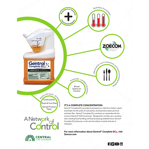 Get broad-spectrum relief from kitchen insects and break the life cycles of German cockroaches, stored product pests, plus fruit flies and drain flies. Gentrol® Complete EC3 combines an insecticide with the control of Gentrol® IGR Concentrate. Designed for use in food handling establishments, Gentrol® Complete EC3 features a Multi-Rate Formulation to tackle all levels of a kitchen infestation.