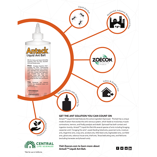 Antack™ Liquid Ant Bait features the active ingredient Spinosad, an effective insecticide, in an attractive sweet liquid bait format which allows easy ingestion and better distribution throughout ant colonies.