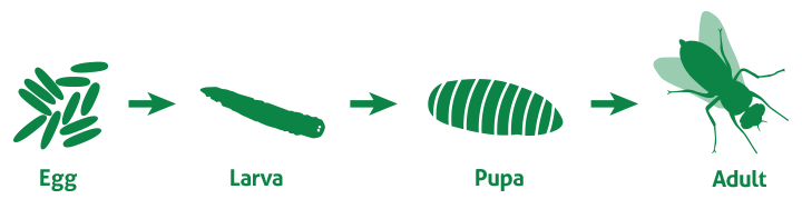 Flies occupy the order diptera and have a four stage life cycle but, depending on the fly's order, different time spans to go through that cyle. Fruit flies take 7 to 14 days, house flies 7 to 10 days and drain flies 10 to 15 days.